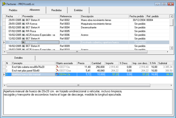 En esta vista se muestran los pedidos, albaranes y facturas emitidas y recibidas del proyecto.
